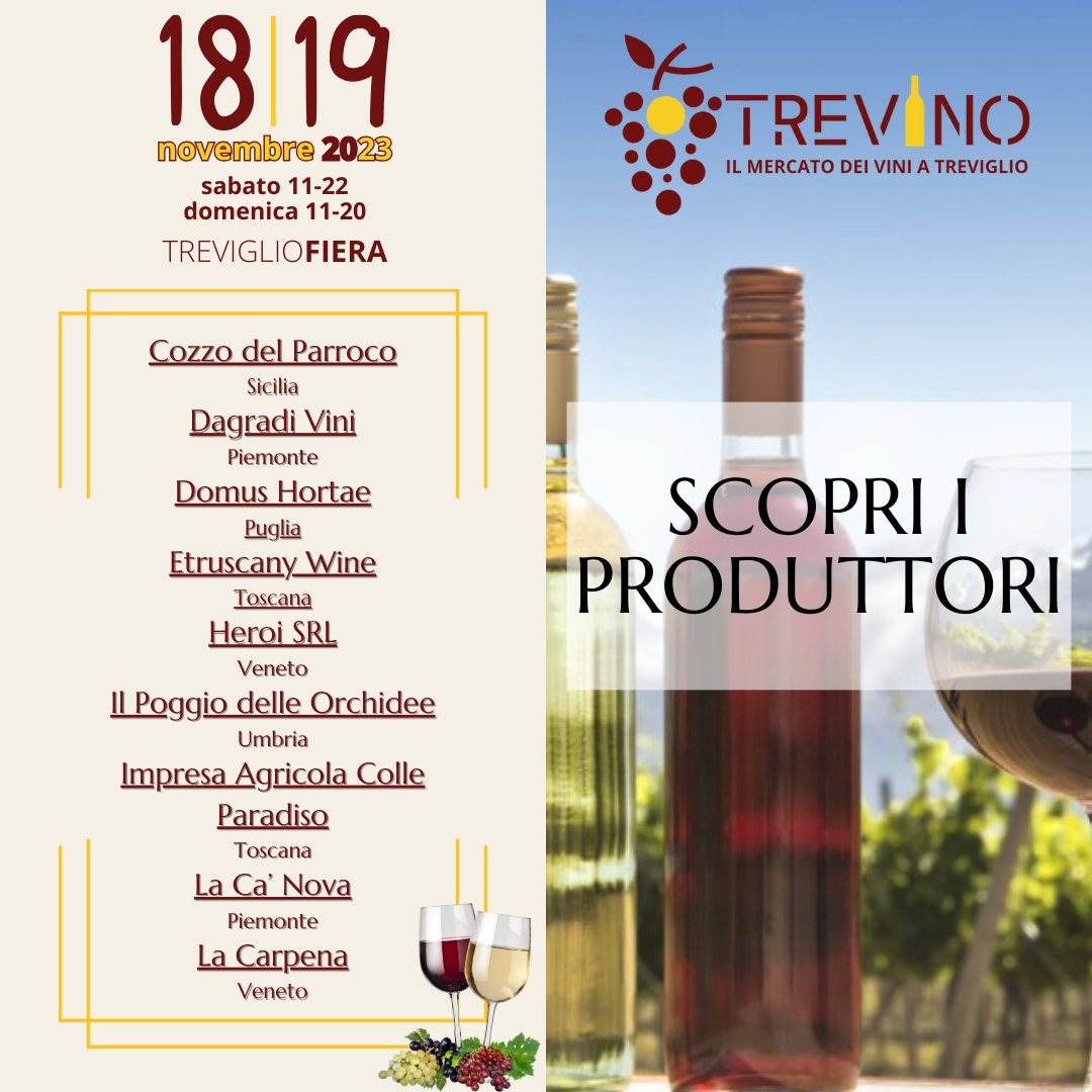 Sabato 18 e domenica 19 novembre 2023 saremo a TREVINO – Il Mercato dei Vini a Treviglio!